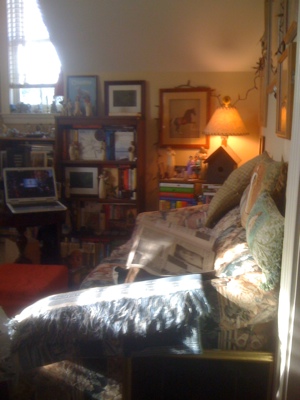 I am happy to be home again!! So happy I took a picture of where I usually write and unwind at night. I sit on the couch, look at the Stubbs horse print, sometimes listen to music, sometimes watch tv and other times write in silence or just sit in silence. I love being home again. Being with my books, my animal prints, meditation area and views I have come to love. I looked out my bedroom window and caught sight of a tree I often talk to. It is the only tree whose bark I can currently see among all the foliage. I tell the tree a lot of things and sometimes I swear the tree speaks back. Not that it answers me but it tells it’s own story. It is older than I am, wiser than me and perhaps I have lived alone too long but I enjoyed looking out my window and seeing it again today and listening to what it had to say.