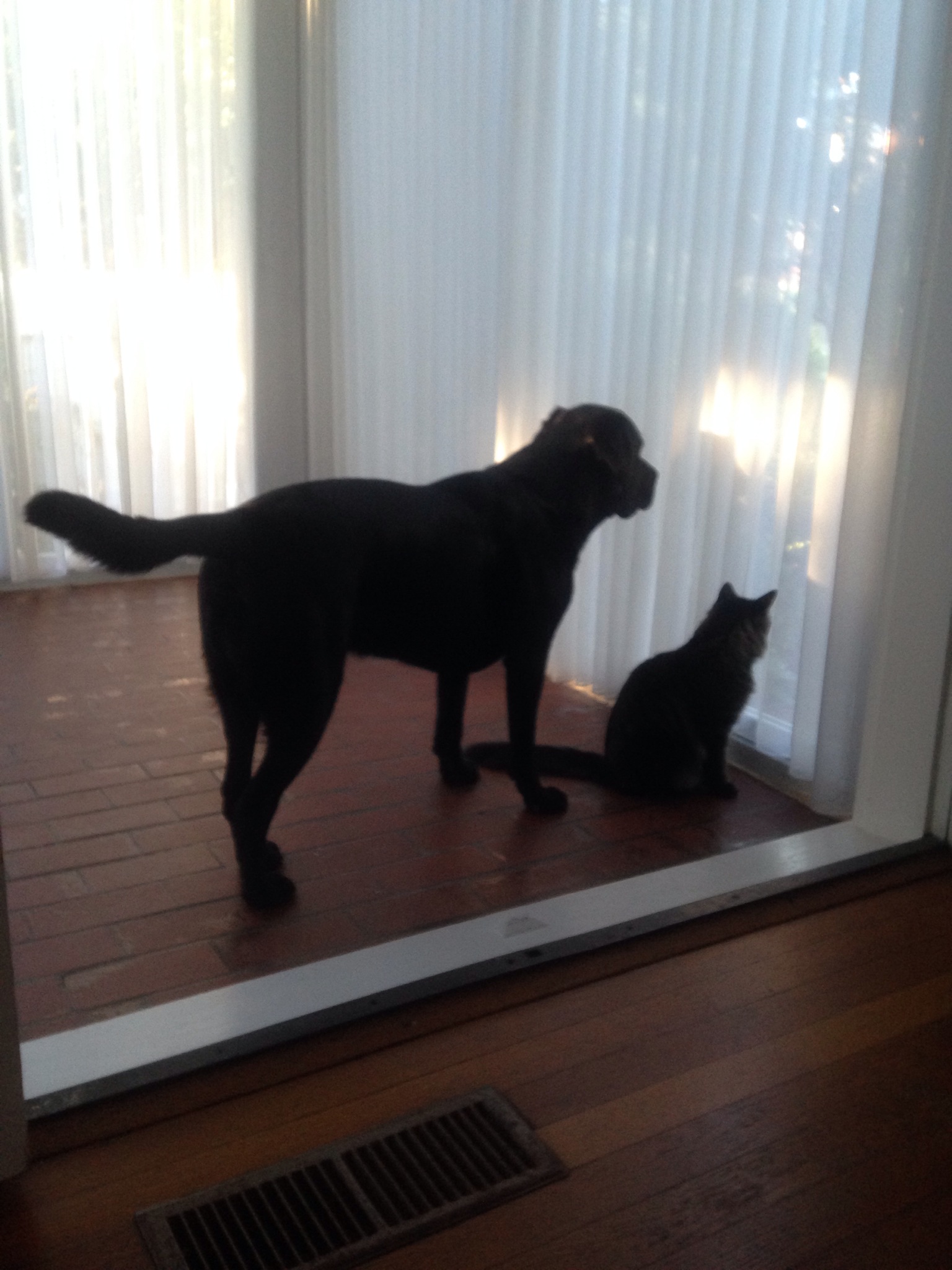 The next photo is of Cooper and Coach Taylor. Coach Taylor is the cat who keeps a keen eye on everything. Cooper is one of my favorite dogs to walk. We go through every socio/economic element on our walks and he quietly walks past everything and everyone. He listens to me and as we walk he keeps an eye on me and every hundred yards or so he taps my knee with his nose never breaking stride. We walk through historic sections of town, past seven churches, past old neighborhoods and a burgeoning neighborhood struggling to reinvent itself. I am mindful a black lab coming down the sidewalk can be intimidating to some people so he sits quietly when I ask him to or we cross the street to make others feel comfortable. I know it’s human nature to judge things whether consciously or unconsciously but if people would just take a moment they would see Cooper is a love bug. I walk other dogs who are smaller and look innocent but would happily sink their teeth in your ankle. Cooper is a great dog and along with Coach Taylor make a beautiful team. They hang out with each other and are a hoot.