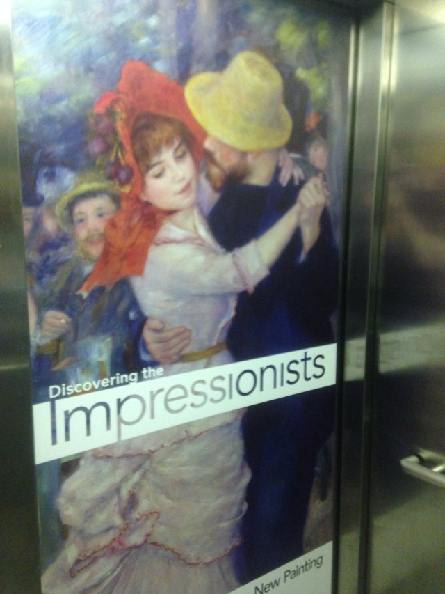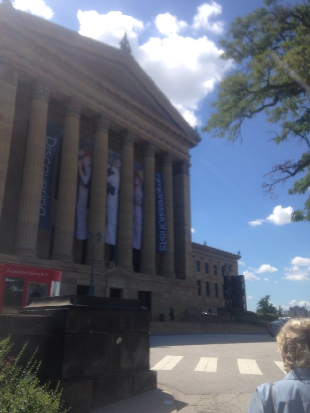 I went  to the Philadelphia Museum of Art with my mom in mid August.  We saw an Impressionist exhibit. It was a large exhibit. Some of the paintings had not been shown together since first painted. My favorites were Renior’s three dancing couples. I also loved a circus painting by Degas. It was a great afternoon. Leaving the musuem we missed a turn due to detours caused by the city preparing for Pope Francie visit this month. Besides enjoying the exhibit it was the first time I noticed my mom slowing down a little. She for the first time did not want to take the stairs but opted for the elavator when offered. She is a few months shy of eighty. But true to my mom nothing slows her down. I found city driving a little stressful and she kept saying I’ll drive. I persevered and we managed to find our way out of the city and back to the farm land where we live. I love living in the quiet countryj but do love my forays into the city. The first two photos are from the day in Philly. The first is the poster in the elavator.