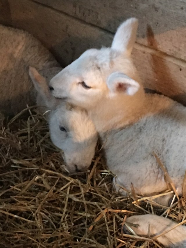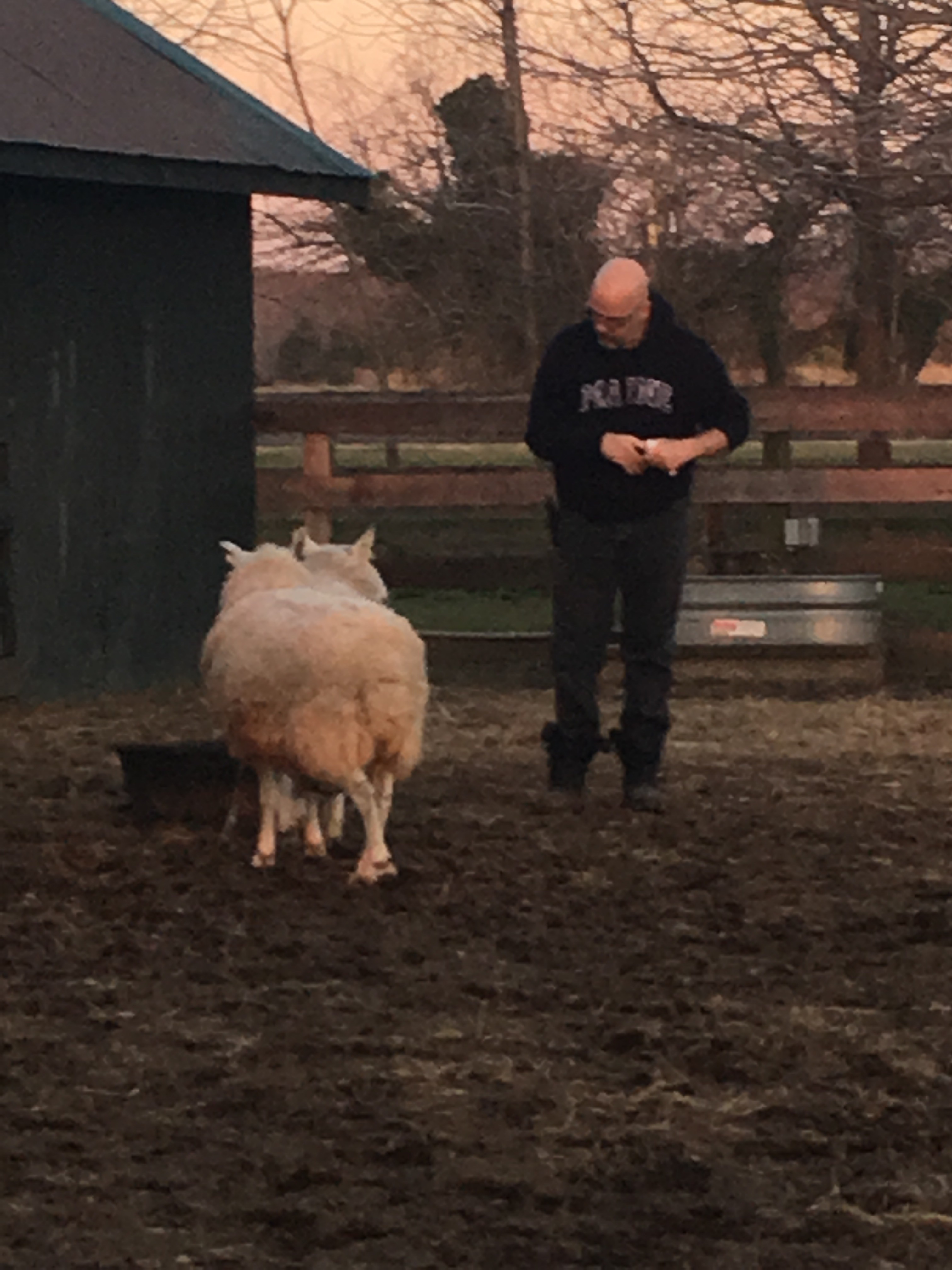 Tonight at the farm is where all the pictures from today were taken. Mike again was very game as we had turned out the moms and lambs to graze today and had to put them back in their stalls for the night which was a little tricky. I had to get a ewe and her twins in one stall, another ewe and her lamb in the end stall and had Mike sit on a straw bale and hold onto the alpha ewe’s lamb in hopes the ewe would hang out with Mike so I could get the others settled. Mike and the lamb seemed to enjoy each other’s quiet company. The lamb and his mom were happy to be get in their stall for feeding. I always feel a little added stress with the onset of lambing season but with Mike’s help I feel better about it.