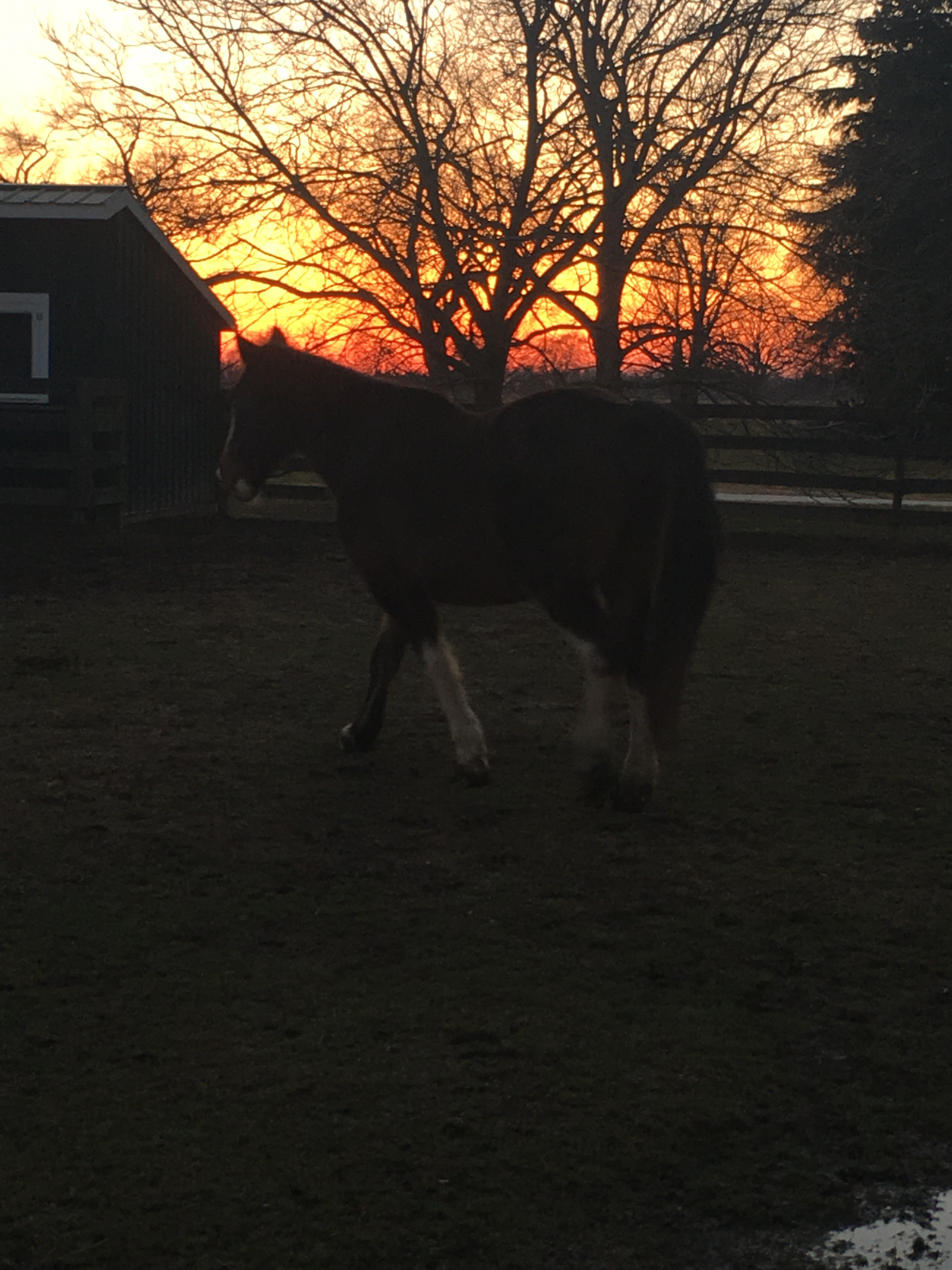 The sunset tonight was beautiful as was the almost full moon rising. I took the sunset photo over the pond and then later got a photo of blue the Clydesdale with the sunset behind him. I enclosed a photo of Mike with the two elderly ewes. I thought it looked as if they were speaking to each other.