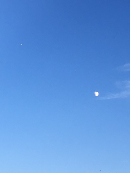 The big picture is something I need to work on both in my personal life and professional life. Lately I have had to focus on the immediate picture due to outside influences and it was while grocery shopping with Mike on Friday that I realized I lost sight of the big picture. We had just come from his physical therapy appointment and he was feeling not the best but he wanted to grocery shop. We headed to the store and usually I push the cart while he grabs the items and keeps track of our running total. He needed the cart to steady himself a little and I found myself lost with having the control of the cart. Without realizing it at first I had grabbed the front of the cart and was still steering it while he pushed it. After two aisles of this I suddenly realized with horror what I was doing. Mike never said a word but I was mortified to find I was such a little control freak. I think a lot of it stems from being alone and fiercely independent for over twenty years. I apologized to Mike and told him I needed to work on that and the fact we are in this together on everything. It has been quite an adjustment for me to be in such a loving and giving relationship with Mike. I need to step back and see the whole picture and not just my picture. These photos of the moon last night with the dot of a jet in the sky as well as sunset tonight reminded me that I in fact control little but how I react to things. Mindfulness is a practice I forget in times of stress. I some homework to do.