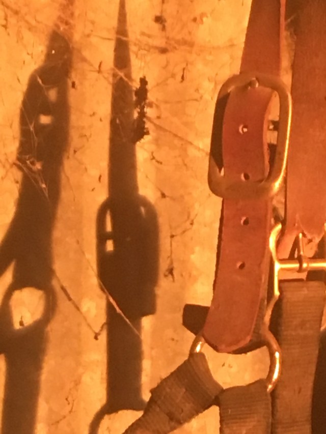 I have been watching the sunset fall into the hay barn over the last few weeks. As the sun marches back across the sky in pursuit of spring I have been enamored by the sun washing into the barn. The way the sun lit up the halters drew me in. The hay barn was recently filled to the rafters with hay so space now is limited which is fine by me.