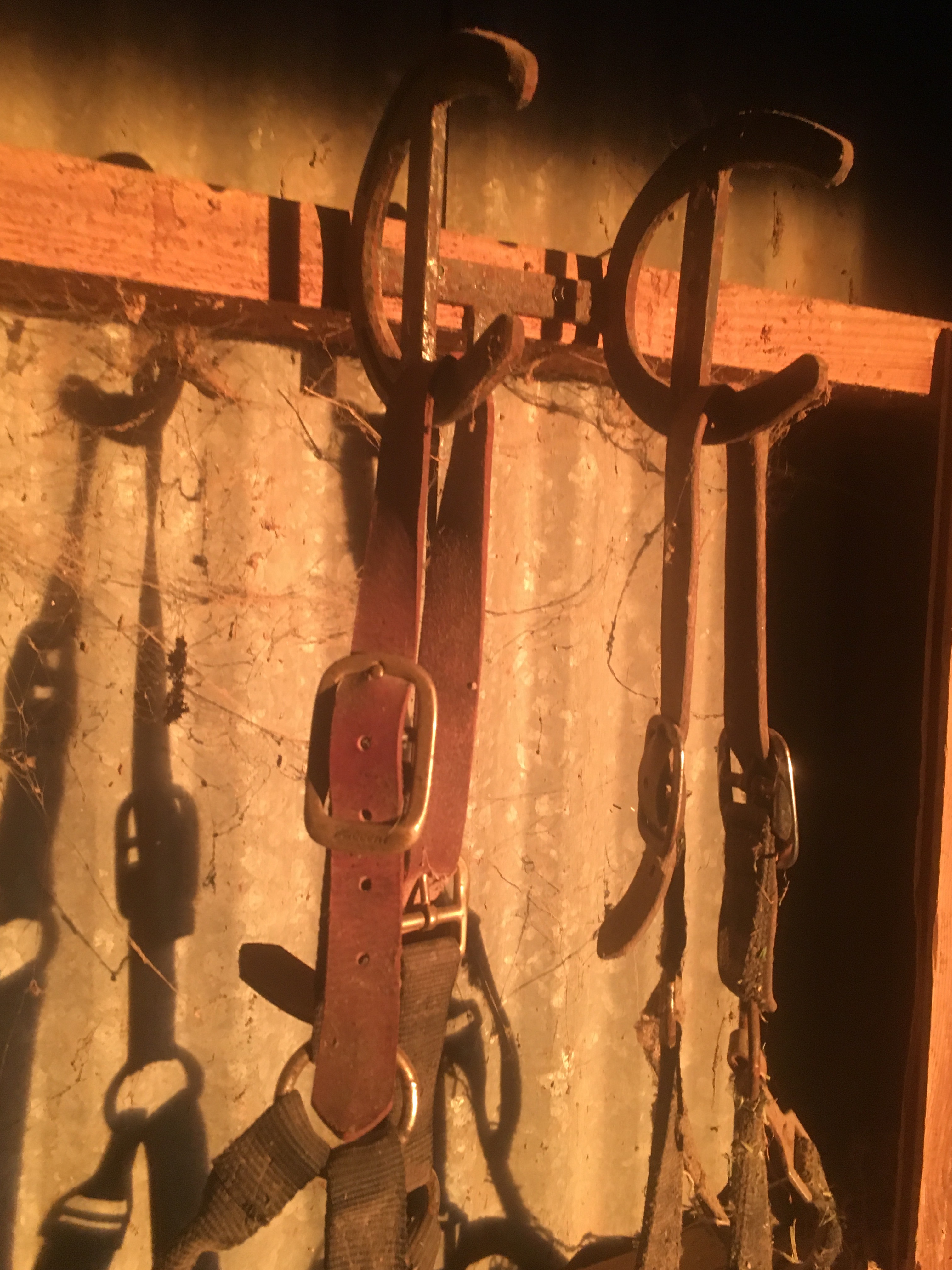 I have been watching the sunset fall into the hay barn over the last few weeks. As the sun marches back across the sky in pursuit of spring I have been enamored by the sun washing into the barn. The way the sun lit up the halters drew me in. The hay barn was recently filled to the rafters with hay so space now is limited which is fine by me.
