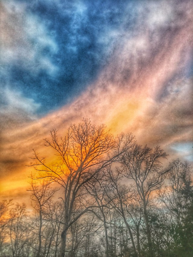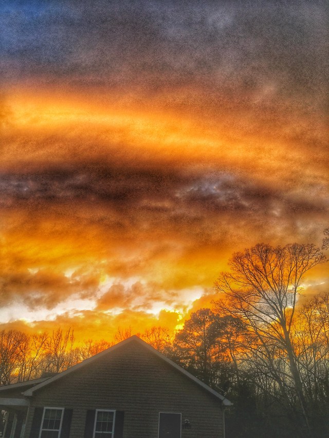 When I woke up this morning Michael said he was happy I let him come to some realizations on his own. He took barely twelve hours to recover from something I thought would be months to get over. He truly has come a very long way in just three years. He forgets how much hard work he has done. I am so proud of him and how he handled everything. This afternoon I was watching the sky and could tell the sunset was going to be fun. It is so unusually warm we were outside in just T-shirt’s and jeans. We walked around our yard avoiding the lakes and ponds that appear every time it rains. We watched buzzards and a few bald eagles circle overhead. We marveled at the brown bats flying. We knew the warm weather brought them out. I wanted Michael to be outside with me to reinforce that it is ok to be in our yard. There was no shooting today so I am hoping the police scared the neighbors a little.