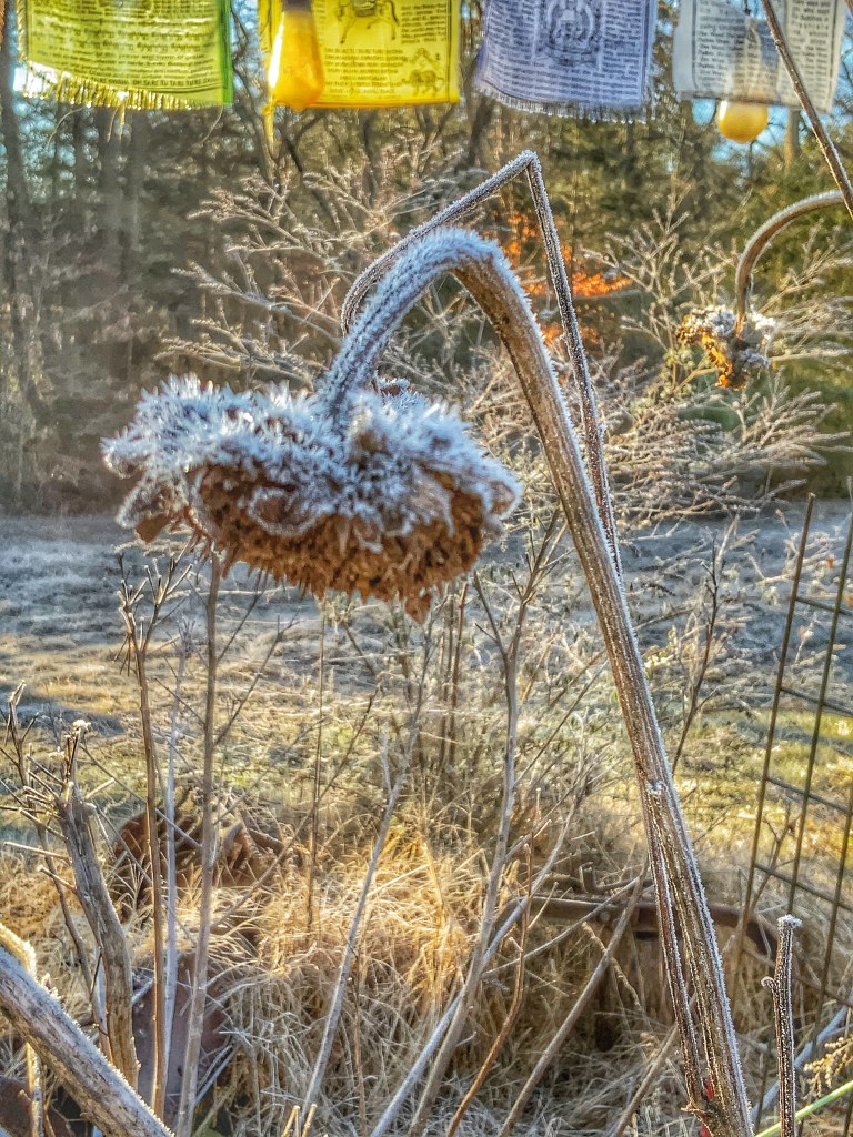 My husband Michael pointed out the frost on the butterfly bush this morning as the sun came out. My iPhone stopped taking photos a little while ago so I went out with his iPad. I loved the way the frost looked. It really made the sunflower stand out. I accidentally flushed a wren when I walked around the bush.