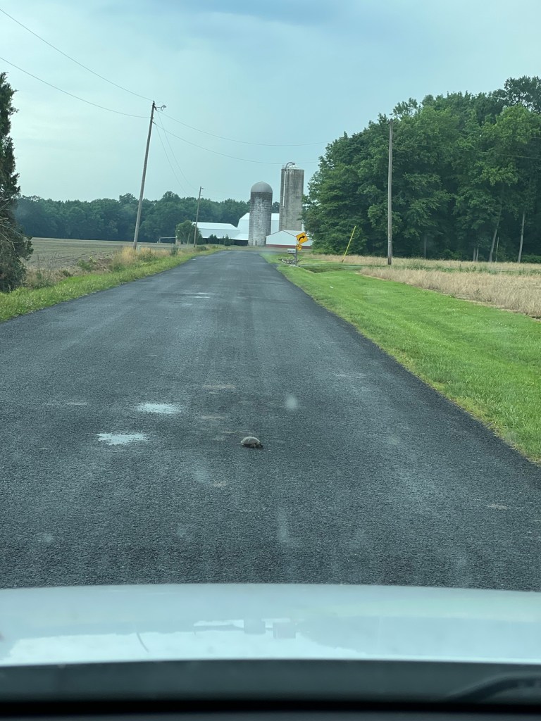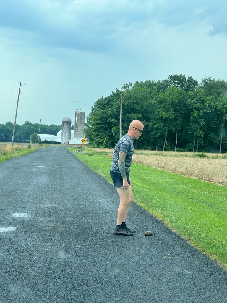 Michael herding the turtle to the side of the road